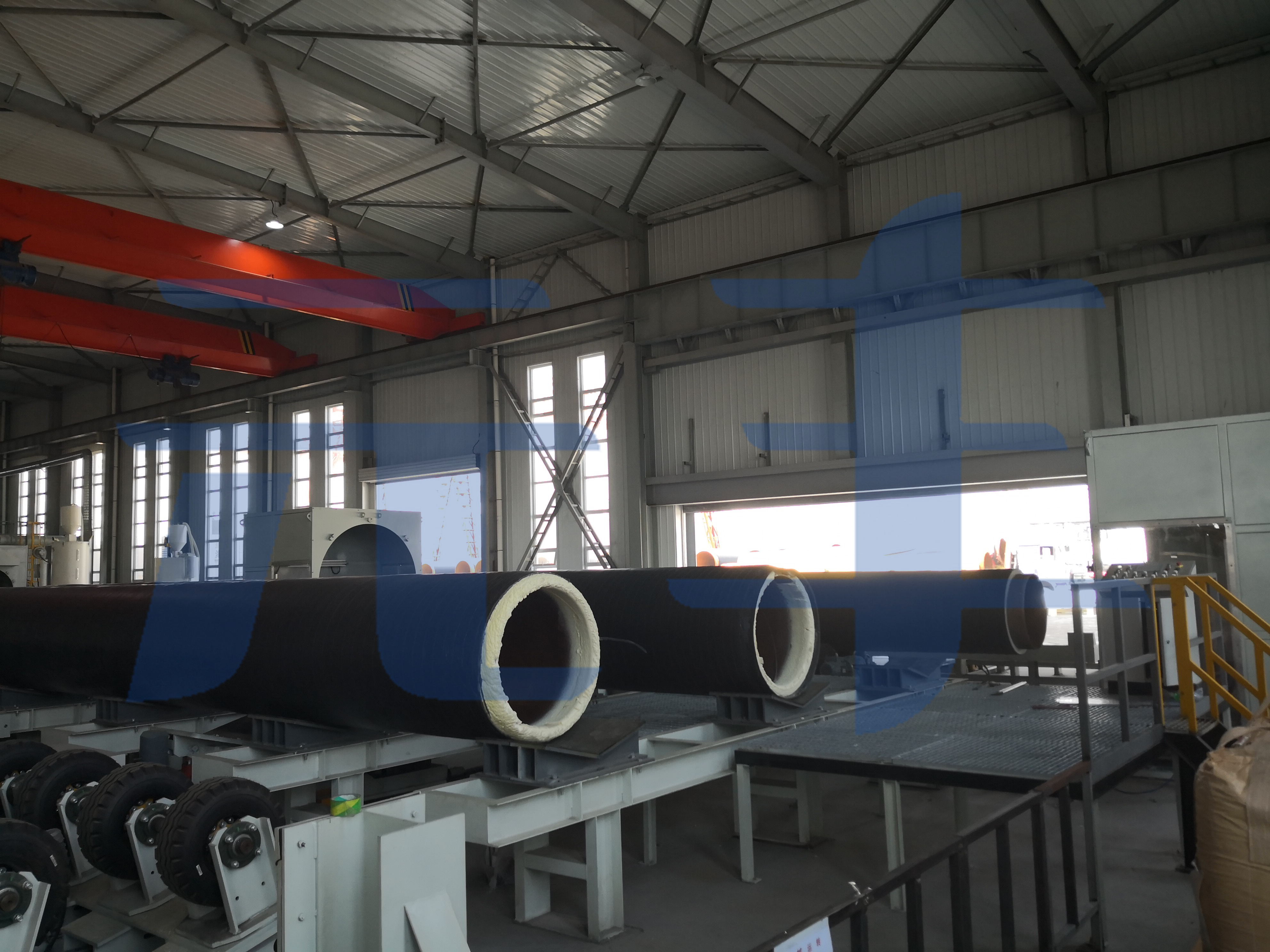 噴涂纏繞保溫管工藝流程為:經(jīng)過拋丸的鋼管經(jīng)中頻加熱裝置進行表面加熱,然后旋轉(zhuǎn)通過泡沫噴涂區(qū),噴涂機將聚氨酯泡沫逐層噴涂至工作鋼管表面,聚氨酯泡沫熟化后的鋼管通過纏繞區(qū),擠出機擠出聚乙烯片料進行多層纏繞,經(jīng)水冷卻后成型,完成防腐保溫工作。最后經(jīng)過管道切割設(shè)備對管口兩端多出部門進行切除,保留150-250mm管口端,完成噴涂纏繞保溫管道的制作。
