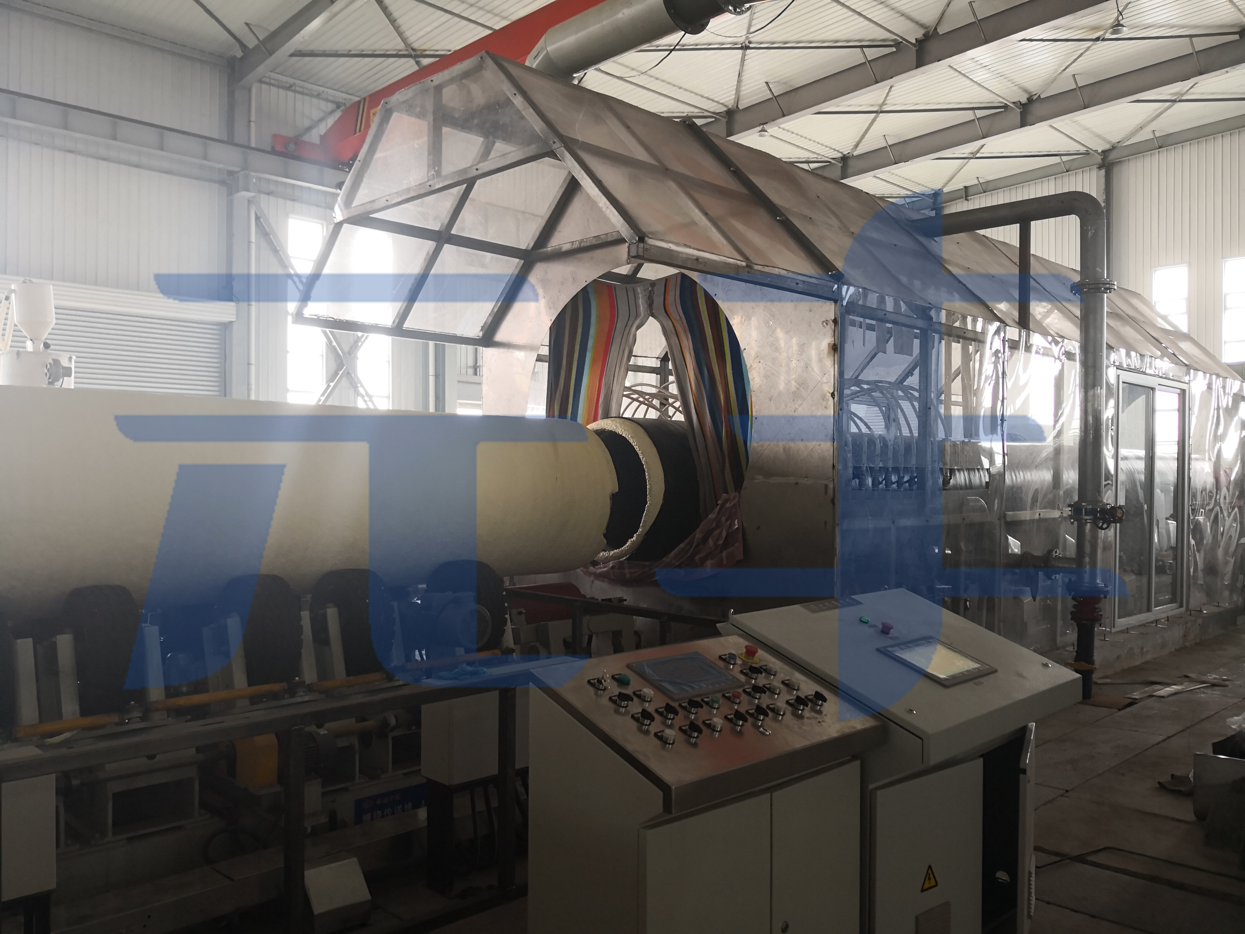 聚乙烯纏繞裝置:擠出設備將熔融的聚乙烯片材連續纏繞到已經反應固化后的聚氨酯泡沫層上,形成連續密實的聚乙烯外護層。由于噴涂纏繞保溫管外護層是在聚氨酯發泡成型后纏繞成型,其不存在發泡時對聚乙烯外保護層產生膨脹應力,因此聚乙烯外護層在保證其使用功能的前提下,可以減薄厚度,節省成本;而且聚乙烯外護層是環向纏繞成型,受工藝拉伸影響,其環向伸長率和抗拉強度指標均會得到明顯改善和提高。