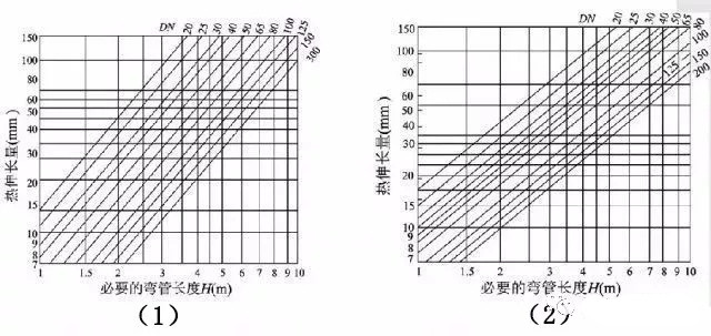 為簡化計算,常用線算圖來確定L型補償器的短臂長度和Z型補償器的中間臂長度。圖二(1)是L型彎管段自然補償線算圖,(2)是Z型彎管段自然補償線算圖。