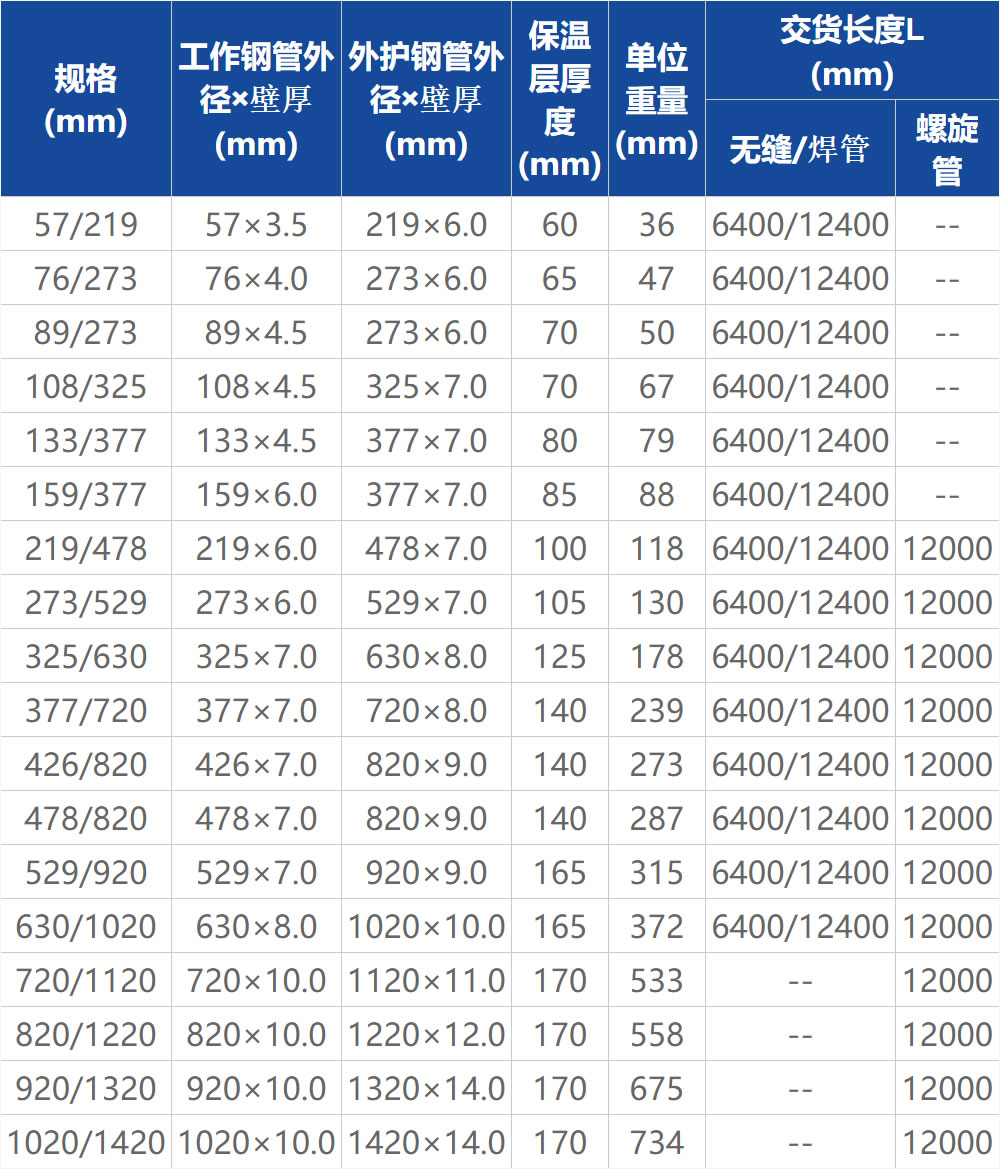 ![]() ![]() 1)工作鋼管 鋼管種類(可選):無縫流體管、埋弧焊螺旋鋼管 2)保溫層 材料種類(可選):無石棉微孔硅酸鈣、耐高溫離心玻璃棉、硅酸鋁針刺毯、納米氣凝膠、巖棉、GQ復合硅酸鹽管殼 3)外套鋼管 鋼管種類(可選):埋弧焊螺旋鋼管、直縫焊管 4)外防腐層 防腐類型(可選):環氧煤瀝青三布五油、聚脲噴涂、3PE、玻璃鋼樹脂、溶解環氧粉末 ![]() |
